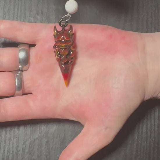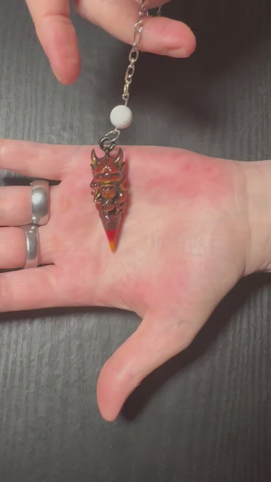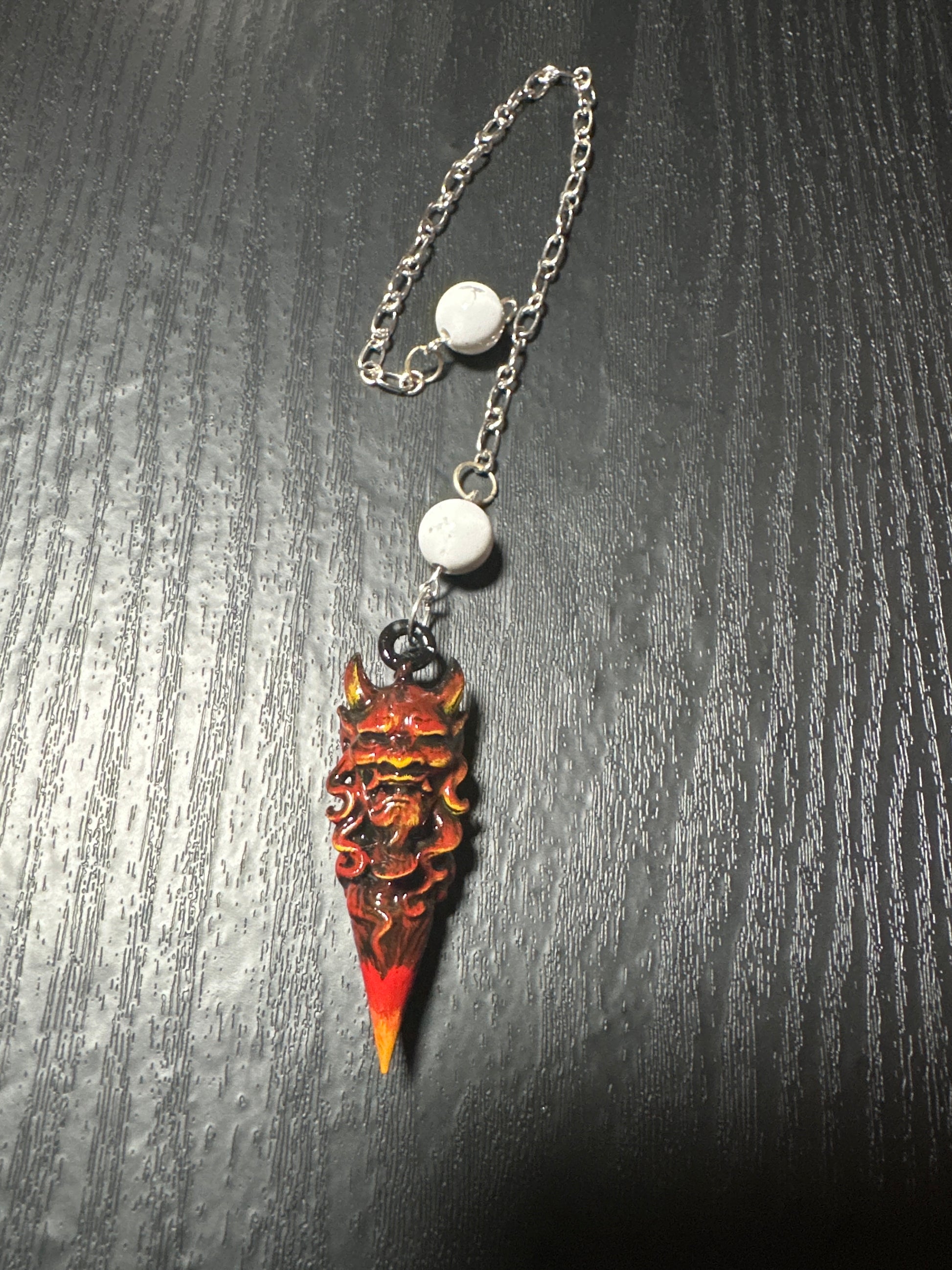 Sculpté de mes mains, modélisé, imprimé, peint et résiné avec minutie, le pendule “Aka-Oni” rend hommage aux puissants yokai du Japon ancestral. Inspiré de l’oni rouge, gardien farouche ou esprit malicieux selon les légendes, il incarne la force brute, la protection rituelle et l’honnêteté sans détour.