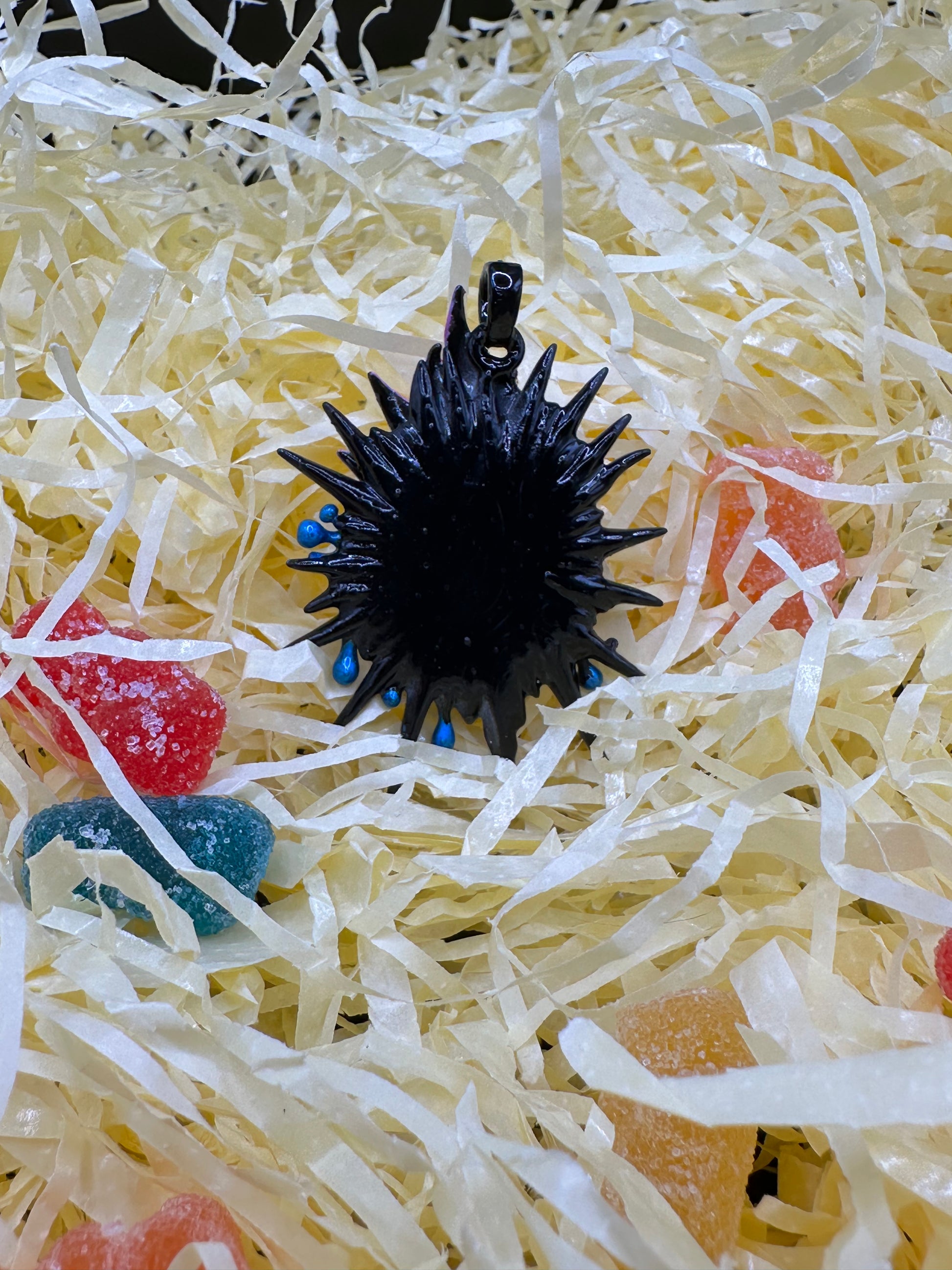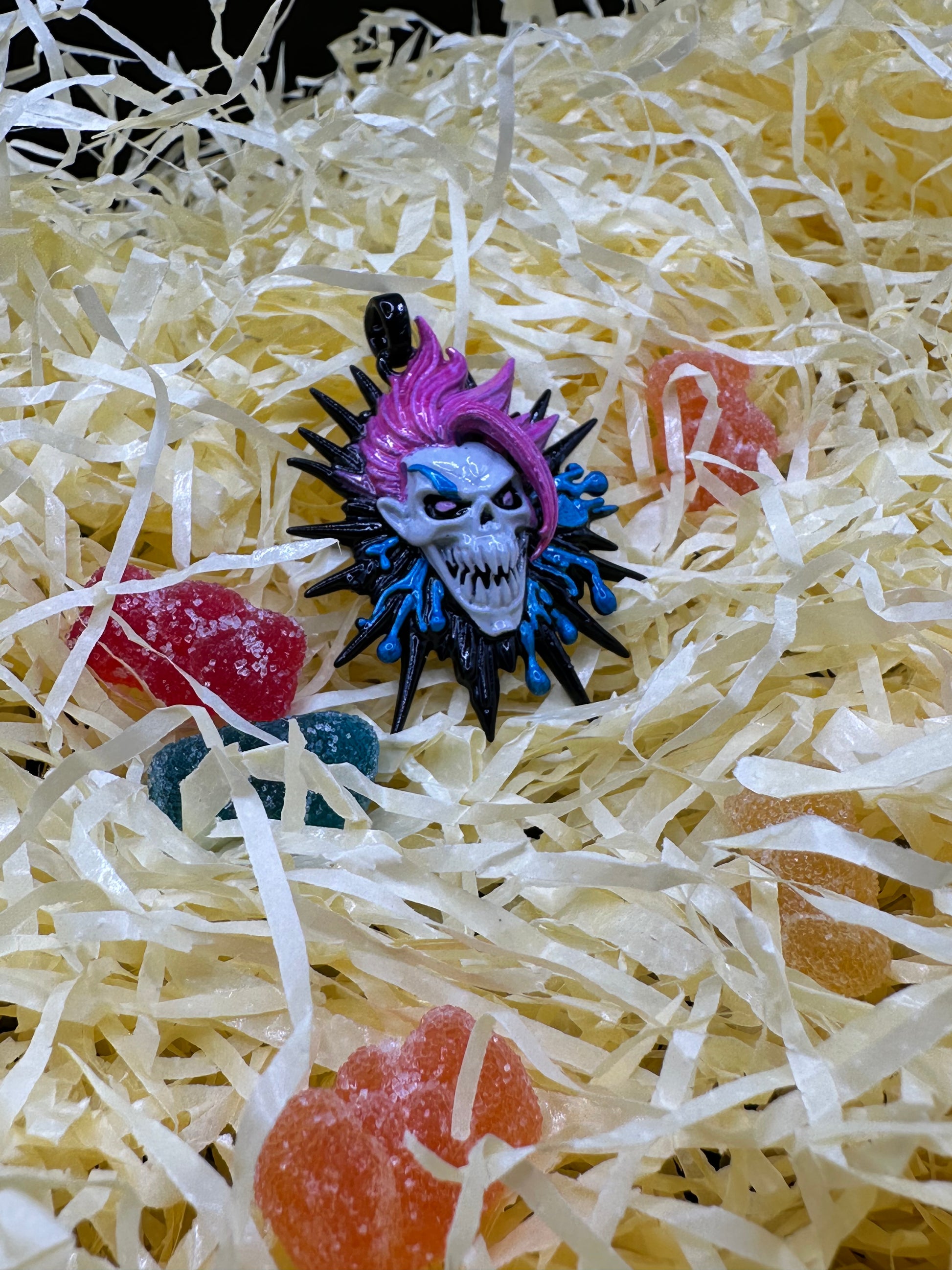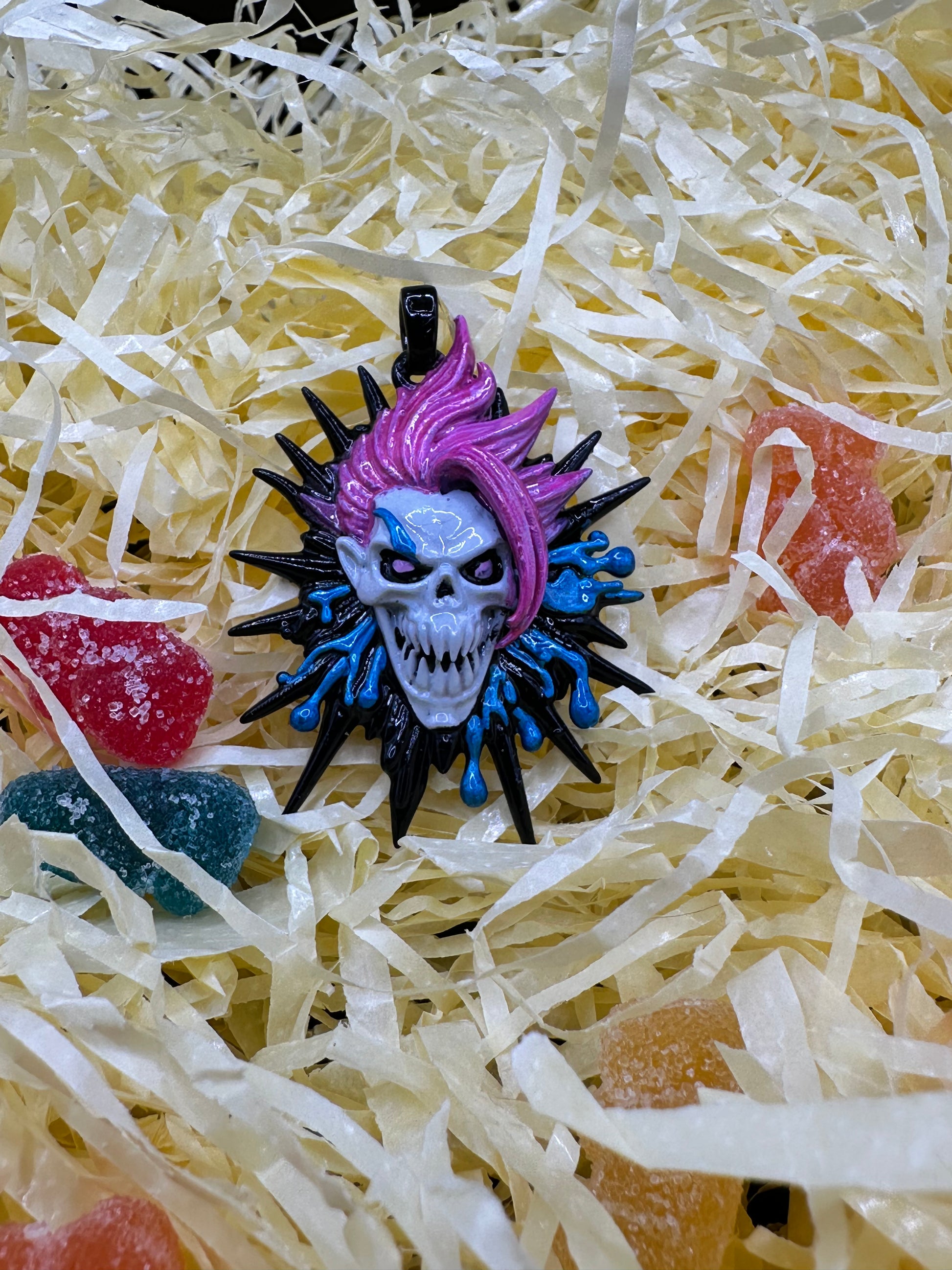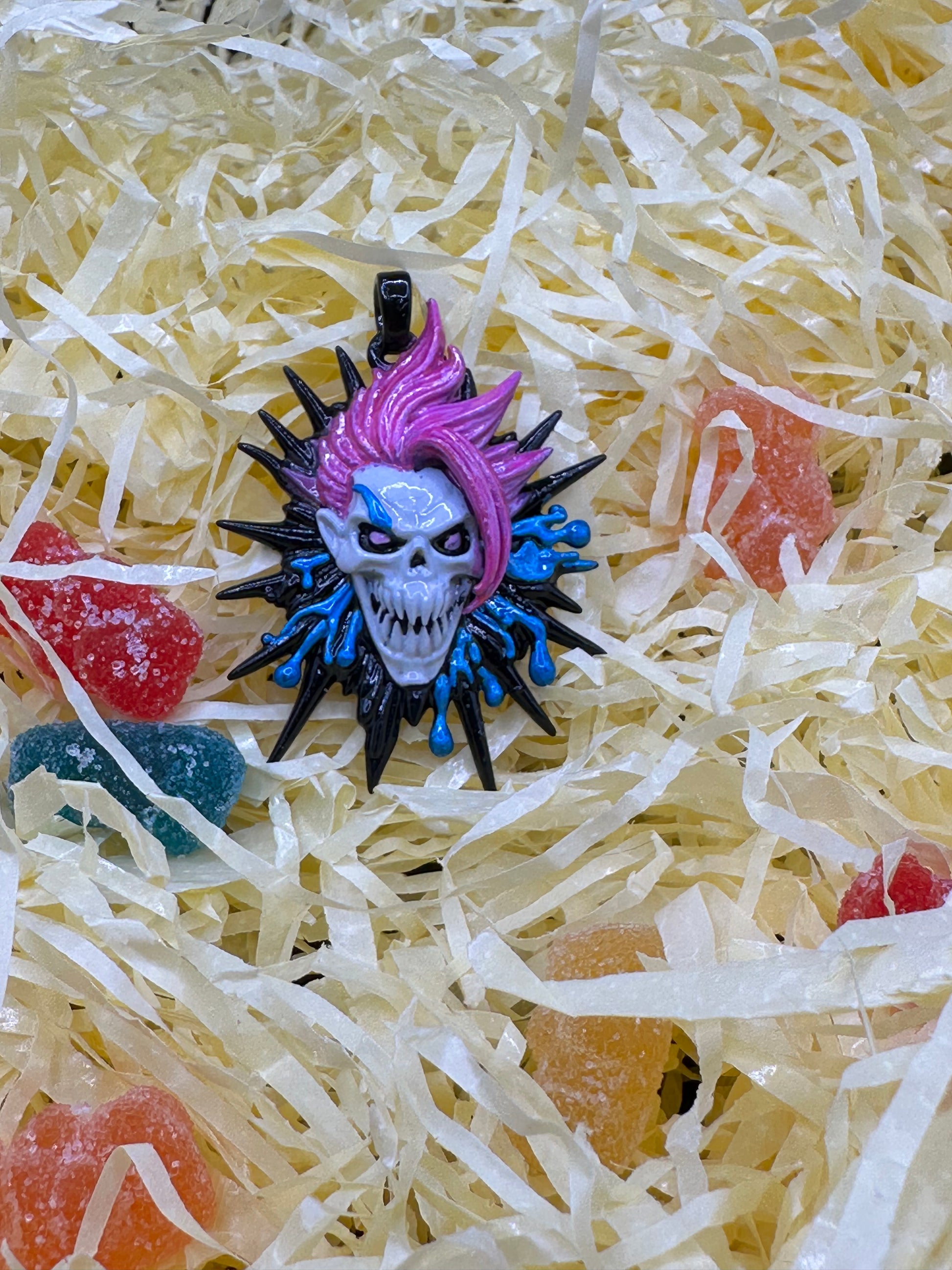 Ce pendentif unique représente un crâne au regard incandescent, entouré de pics noirs et de flammes bleues, symbole d’une énergie brute et indomptable. Sa chevelure violette flamboyante incarne l’esprit rebelle qui refuse de plier face aux règles et aux chaînes du monde.