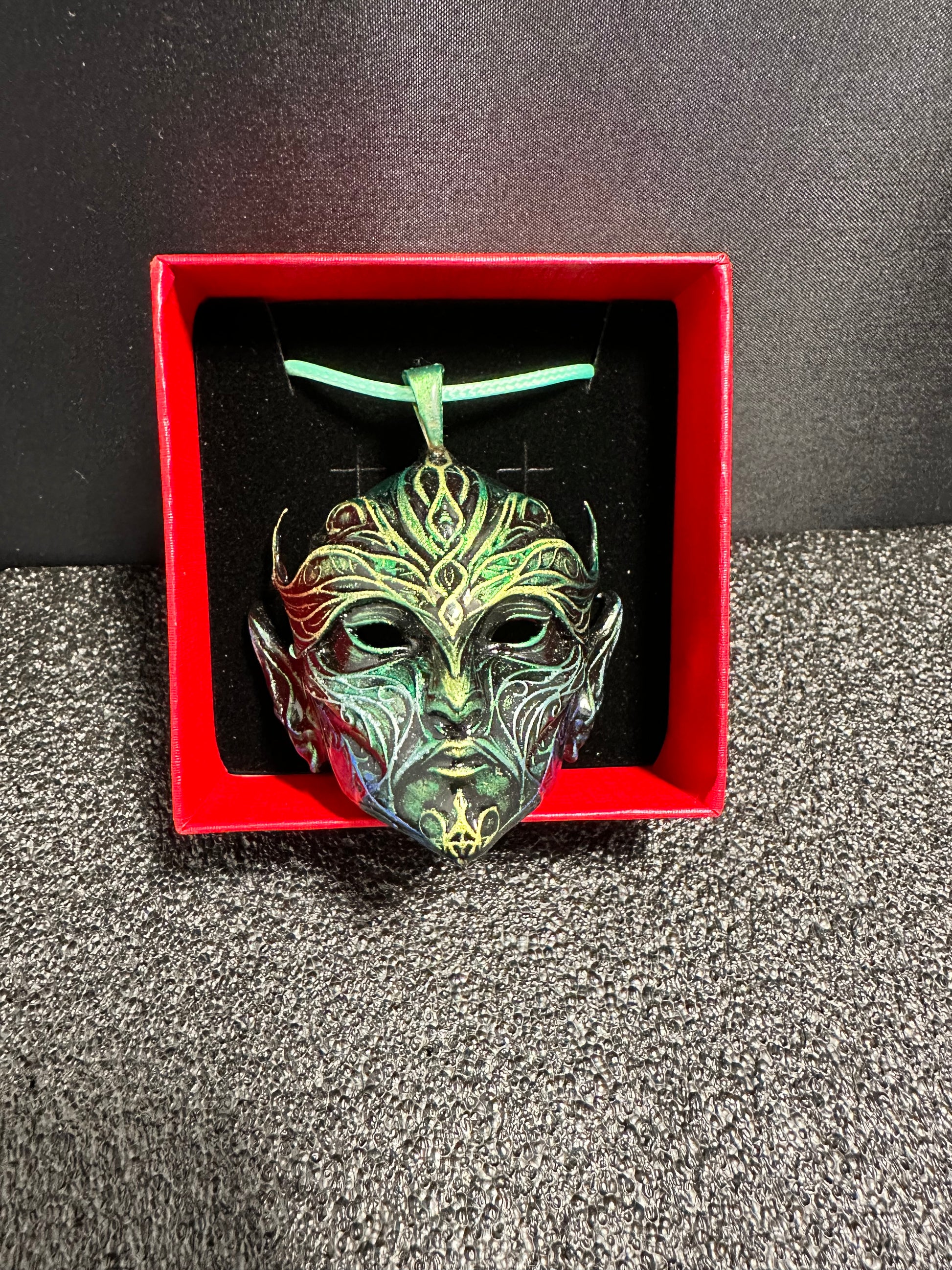 Ce pendentif, aux teintes vertes et dorées, évoque l'abondance et la beauté de la nature. Représentant le visage d'un dieu protecteur de la nature, il est une célébration de la vie végétale et de la terre nourricière.