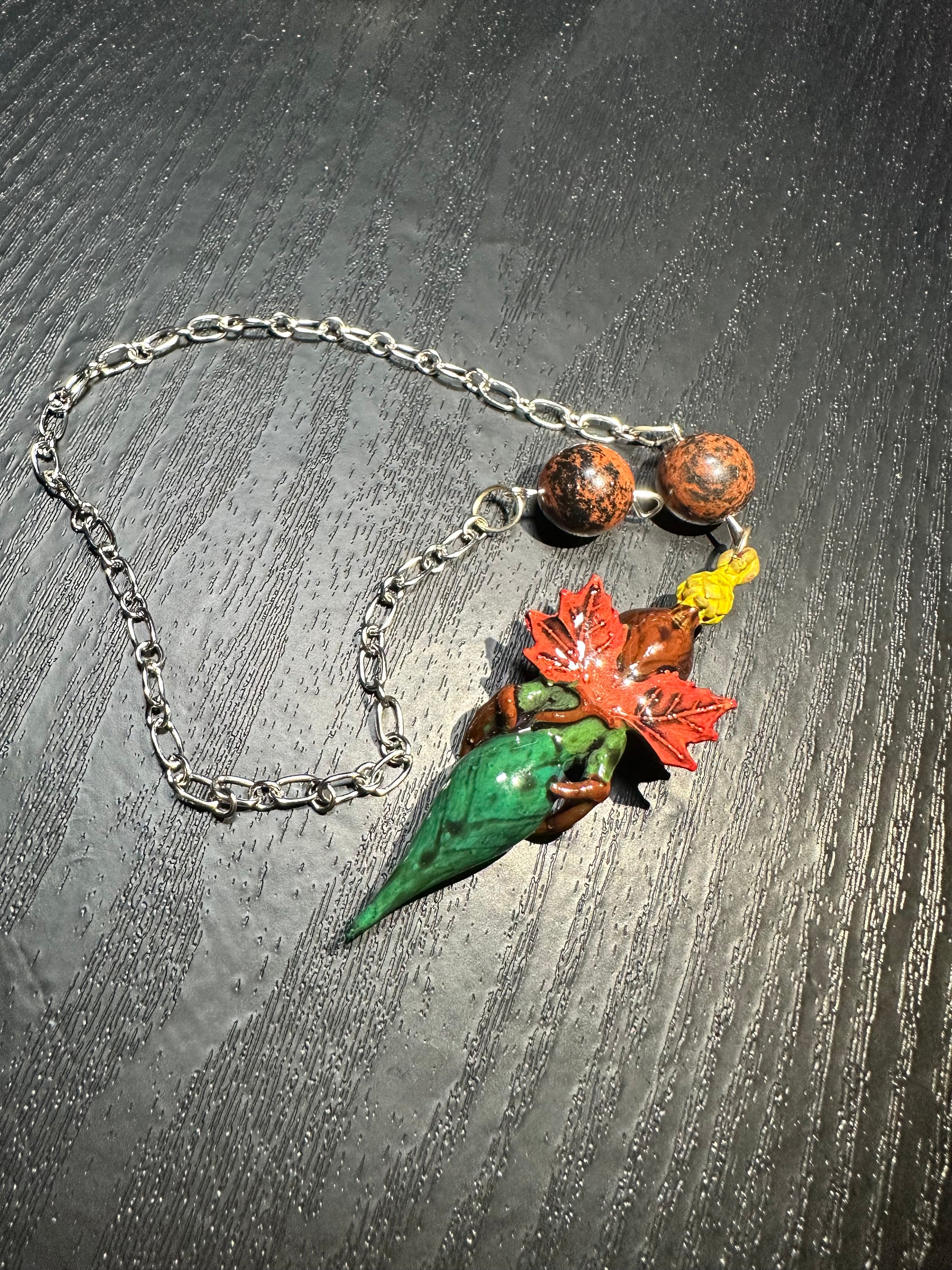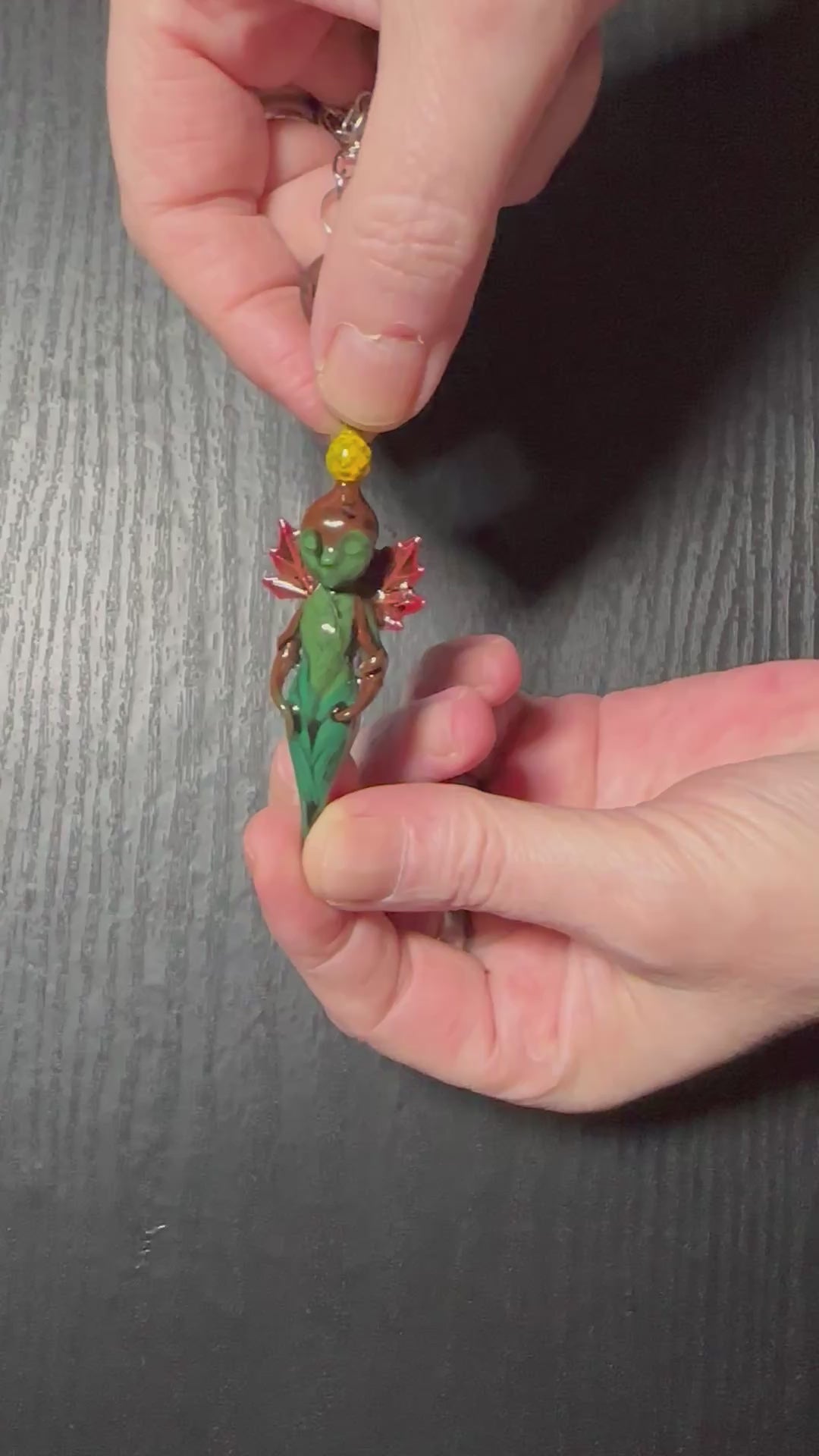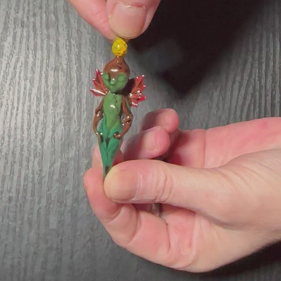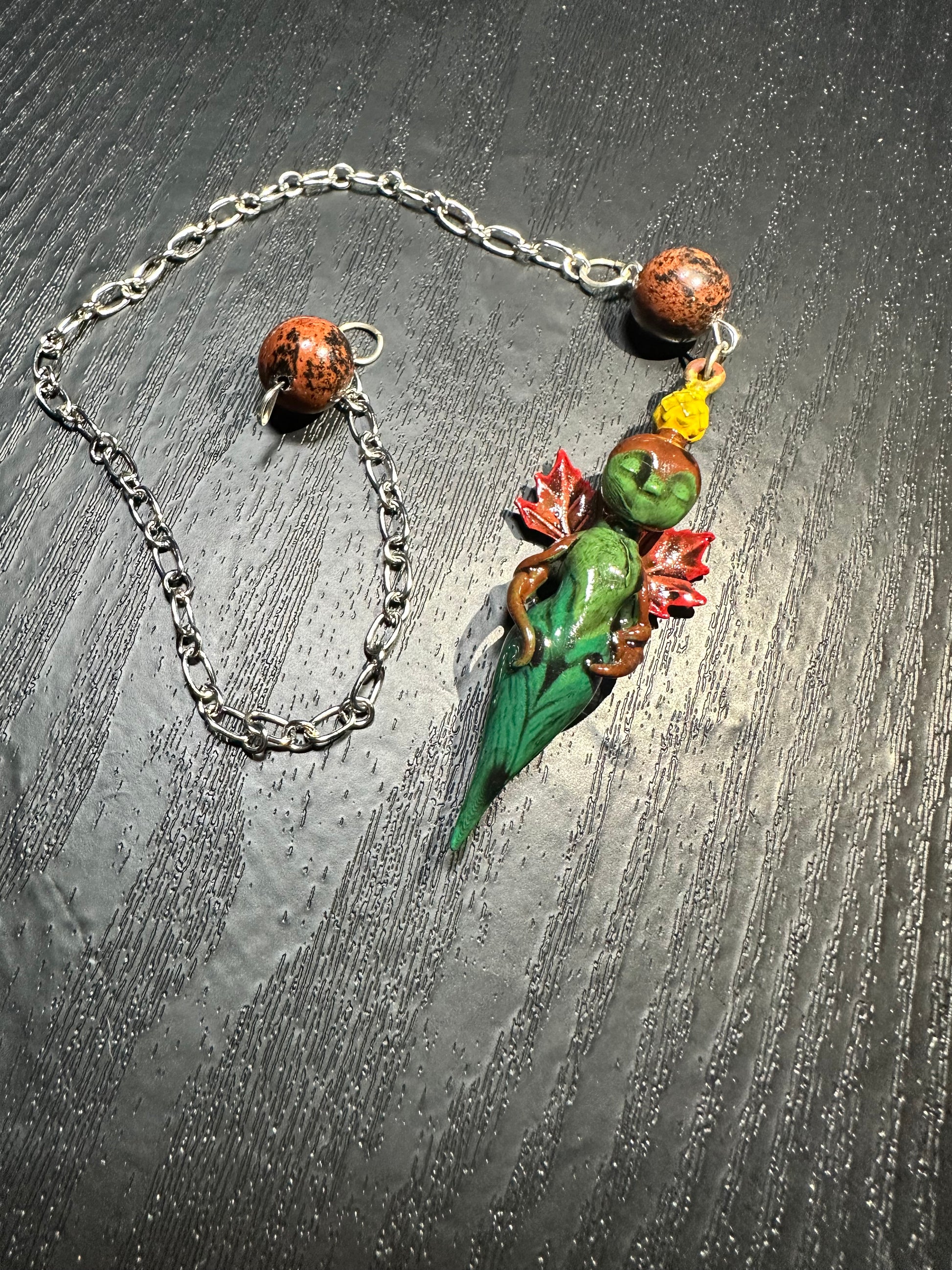 Entièrement imaginé, modélisé, imprimé, peint et résiné à la main avec passion, ce pendule unique incarne la magie profonde des forêts oubliées. “L’Esprit Sylvestre” représente un petit être mystique, fusion entre feuille, écorce et esprit élémentaire. Ses ailes de feuilles rouges flamboyantes symbolisent l’énergie vitale, tandis que sa posture protectrice rappelle les esprits gardiens de la nature.