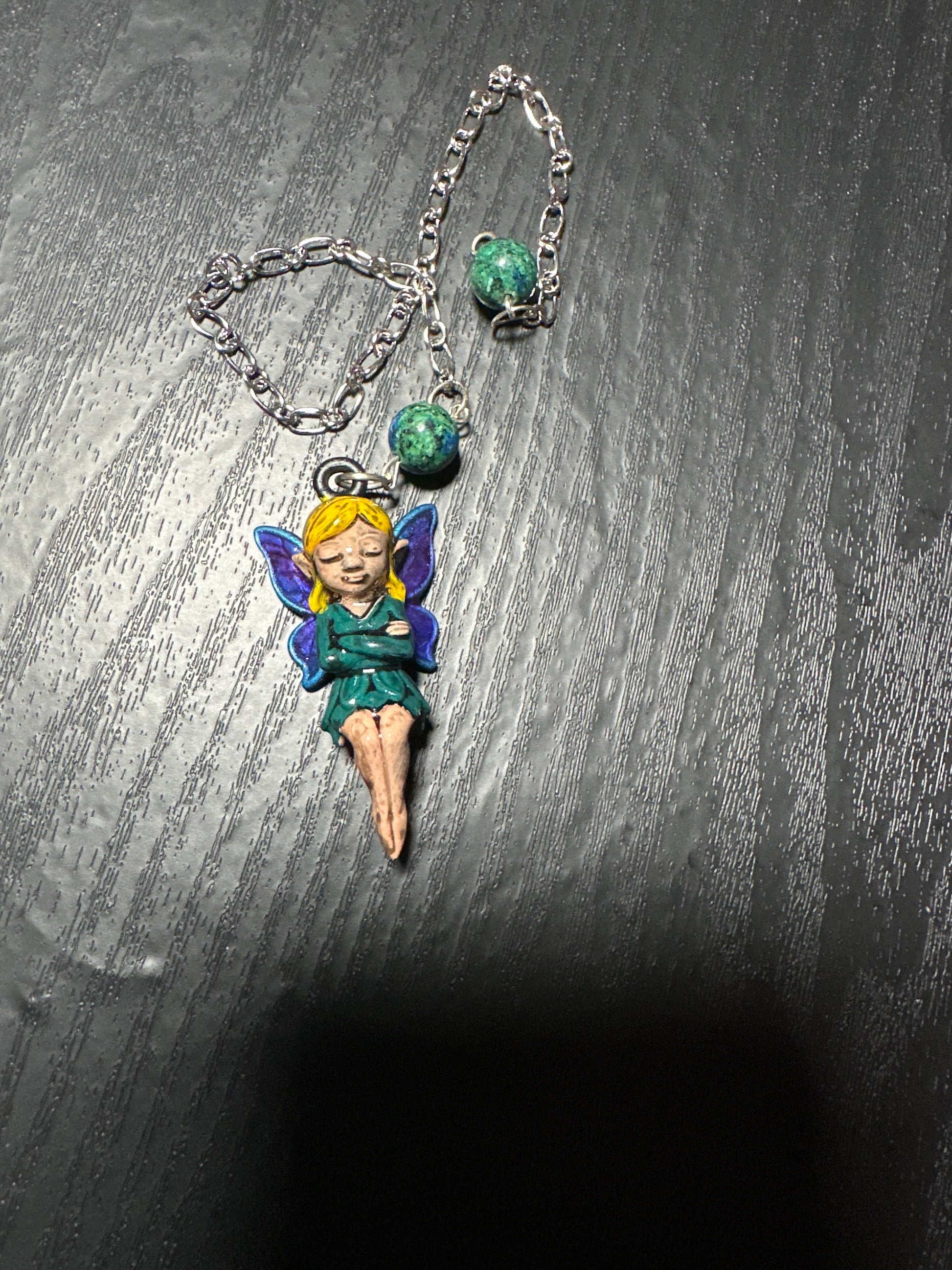 Créé entièrement à la main – de la modélisation à l’impression 3D, peint avec soin et résiné pour une finition éclatante – le pendule “Sylphéa” incarne la douceur des esprits de la nature. Cette petite fée paisible, yeux clos et ailes violettes, semble méditer dans le calme d’un sous-bois enchanté.